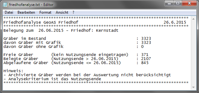 Die Funktion Analysen > Belegungsstand (Tag) berechnet für ein beliebiges Datum den jeweiligen Belegungsstand unter Berücksichtigung aller Grabtypen.
