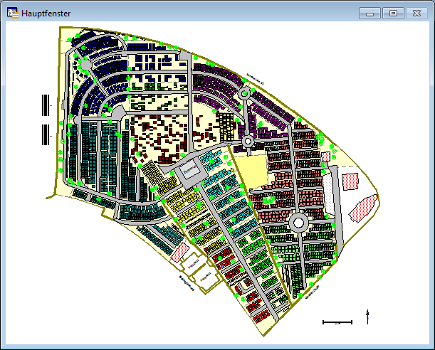 Als Ergebnis der Option Thematische Karte werden die jeweiligen Grababteilungen in unterschiedlichen Farben dargestellt. Im Legendenfenster wird in Klammern eine Statistik eingeblendet, die über die Anzahl der Grabstätten in den einzelnen Grababteilungen informiert.