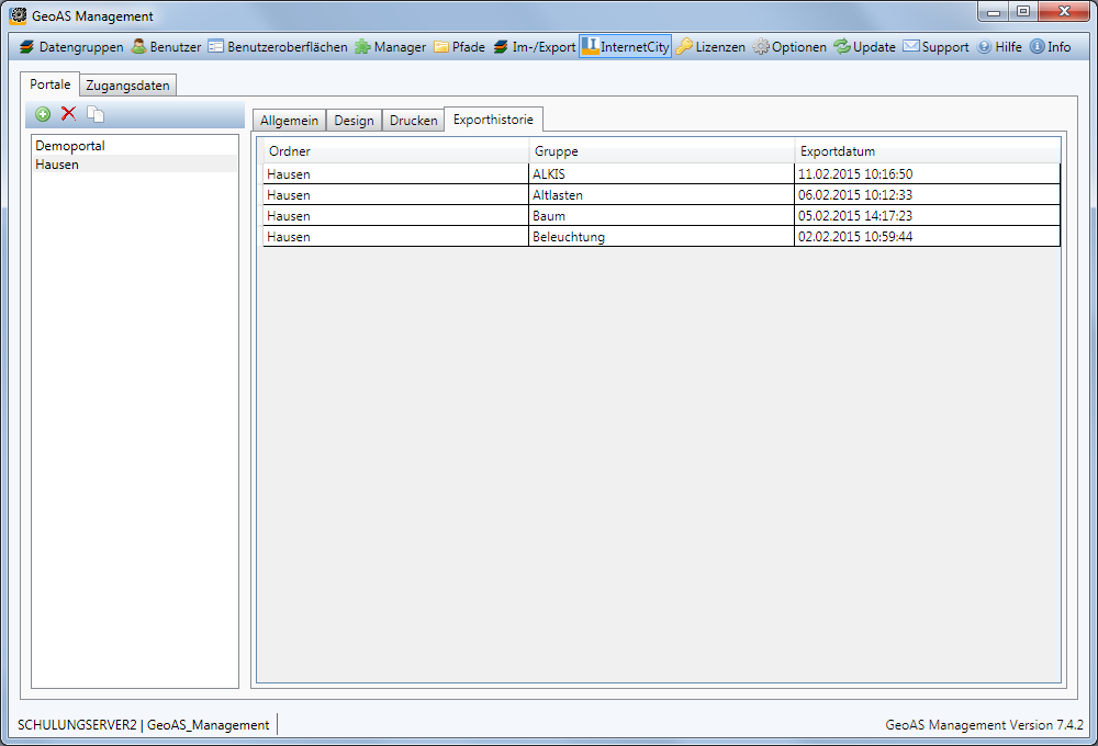 In der Exporthistorie wird für jedes Portal separat dokumentiert, wann die Gruppen zuletzt publiziert wurden.