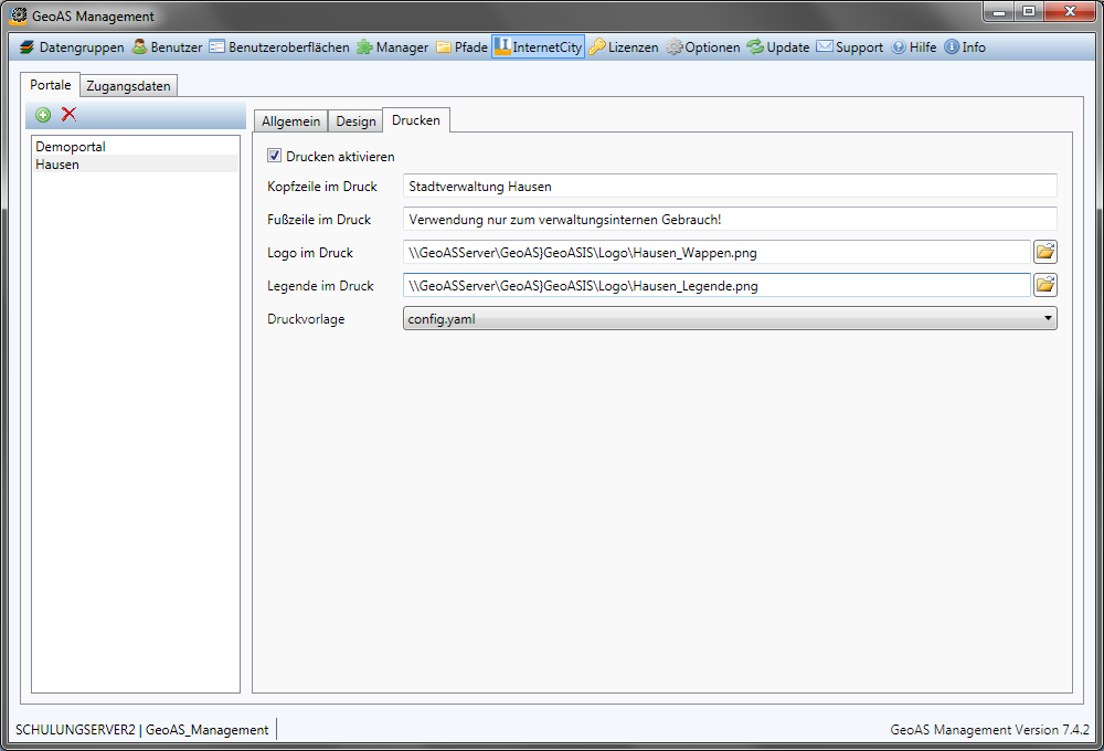 Ist die Option Drucken aktivieren aktiviert, erscheint im Portal eine Drucker-Schaltfläche.