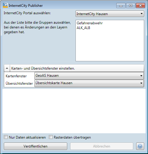 Mit der Funktion Administration > InternetCity veröffentlichen werden die in GeoAS Project vorbereiteten Daten und Konfigurationen in das Web-Geodaten-Portal GeoAS InternetCity publiziert.