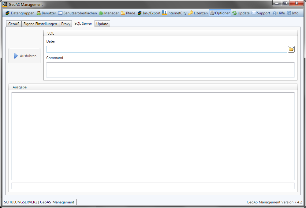 Über diesen Dialog können bei Bedarf Skripte bzw. Befehle ausgeführt werden, um die GeoAS Management-Datenbank zu modifizieren. Dieser Dialog dient ausschließlich zu Supportzwecken. Über die Fernwartung kann der Support (beispielsweise per TeamViewer) auf das System zugreifen und die nötigen Einstellungen vornehmen.