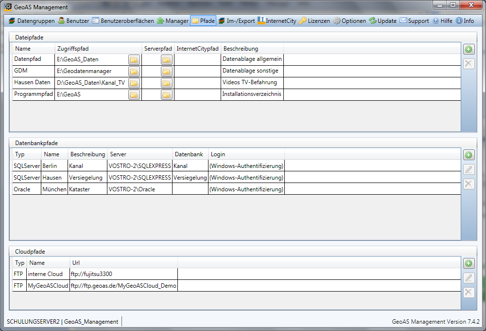 Mit Cloudpfaden werden Freigaben (Verzeichnisse) in der Cloud für den Im- und Export von Geozips angegeben. Jeder Cloudpfad erzeugt ein Register im Register Im-/Export für Gruppen.