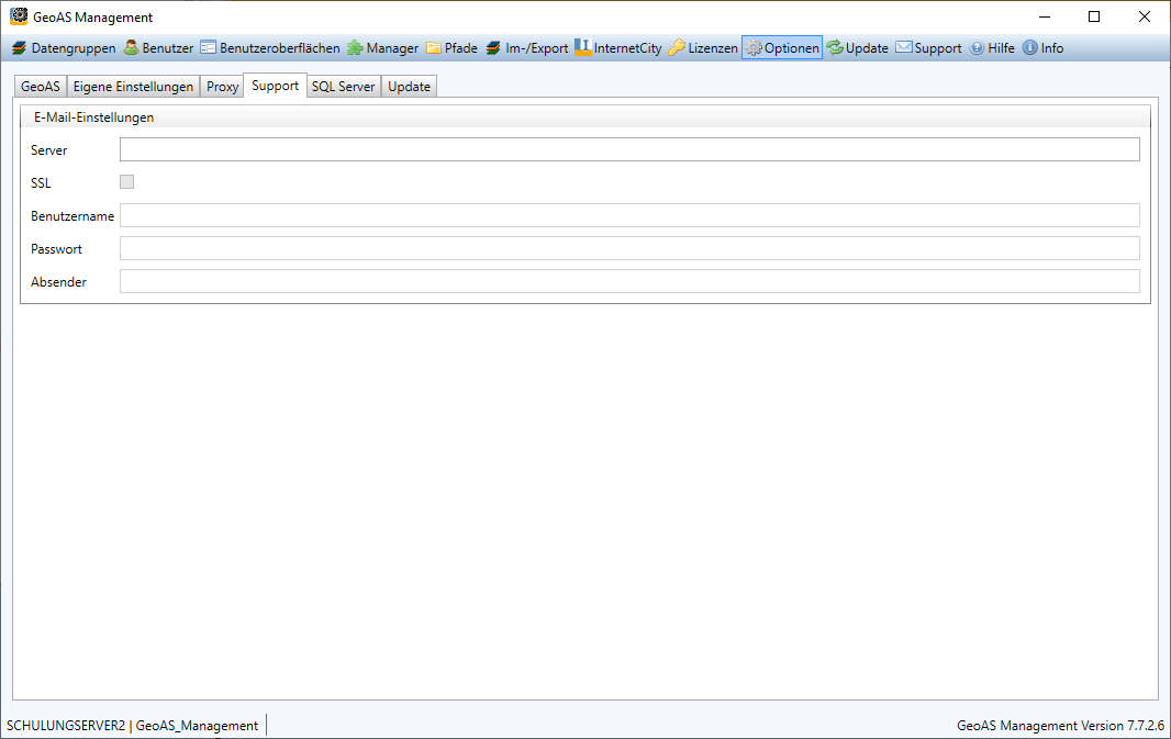 Die Funktion Support kontaktieren generiert automatisch eine E-Mail an den GeoAS Support. Diese Funktion kann entweder vom Administrator direkt im GeoAS Management über Support oder von den Anwendern über das Menü Hilfe > Support kontaktieren aufgerufen werden. Um Konflikte mit verwendeten Firewalls zu vermeiden, kann der GeoAS Administrator über das GeoAS Management die erforderlichen Einstellungen des zu verwendenden Mail-Servers eintragen.