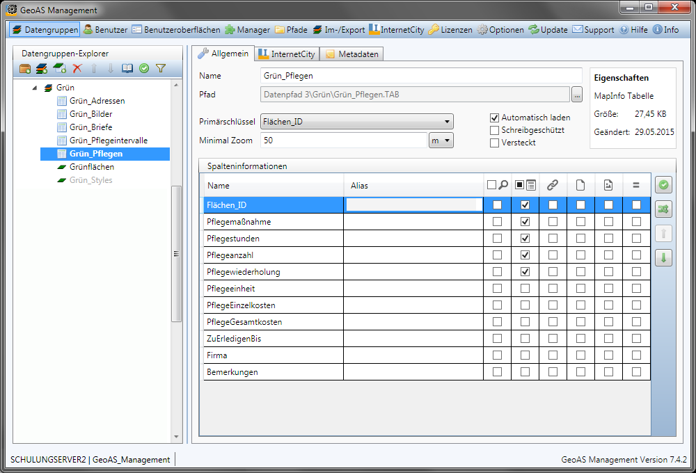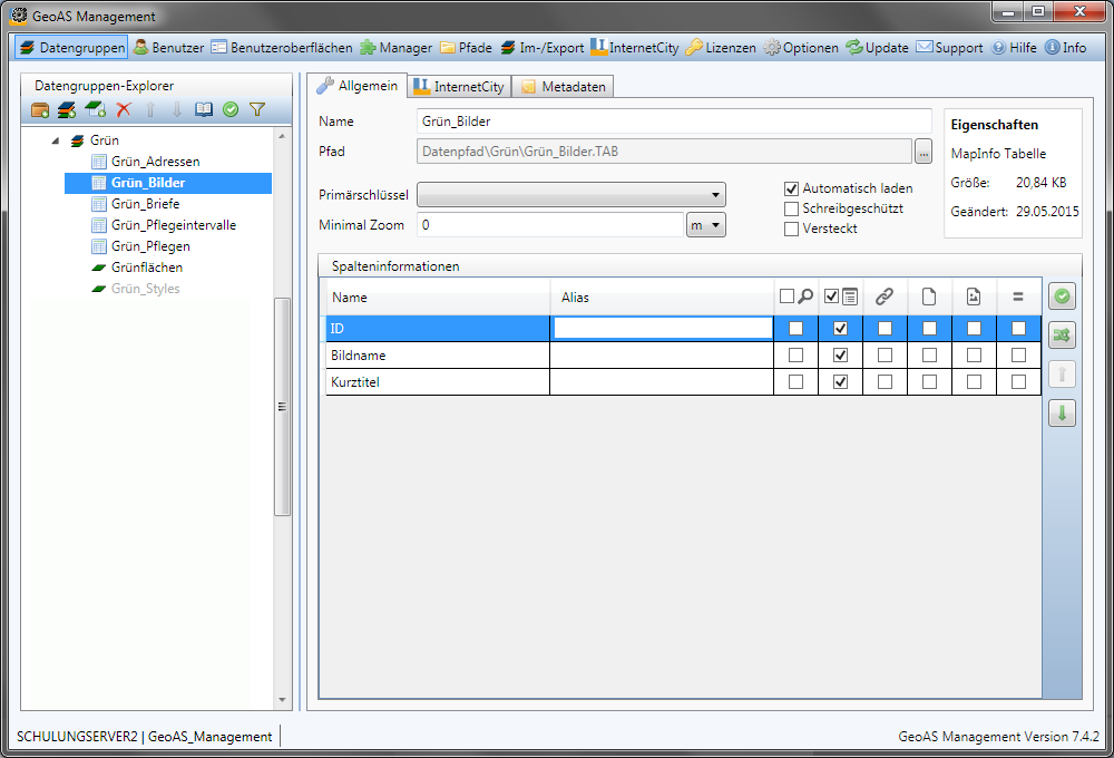 Einstellungen Stil der Karteikarte: Die Tabelleninformationen können als Karteikarte entweder in einer Box in Blockform (alle Spalten eines Datensatzes untereinander) oder in tabellarischer Form (alle Spalten eines Datensatzes nebeneinander) dargestellt werden. Diese Einstellungsmöglichkeit bezieht sich ausschließlich auf Untertabellen (z.B.: Grün: Grün_Pflegen, Grün_Briefe, Grün_Bilder), die zuvor im MultiEditor-Manager mit der entsprechenden Haupttabelle (z.B.: Grün: Grünflächen) miteinander verknüpft wurden. Ergänzend dazu muss im GeoAS Management im Datengruppen-Explorer auf Tabellenebene die Karteikartenfunktionalität bei den Spalteninformationen aktiviert werden.