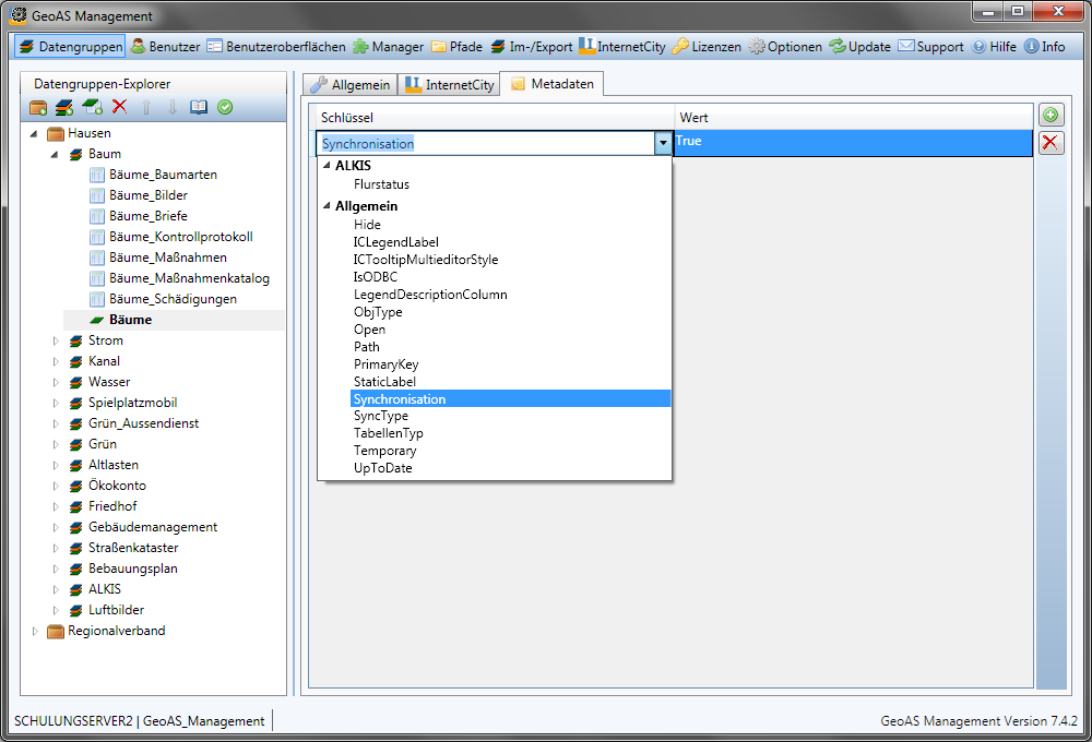 In den Metadaten können ergänzende Informationen zu den jeweiligen Tabellen hinterlegt werden (u.a. auch zu verschiedenen erforderlichen Einstellungen für den Betrieb der Fachmodule).