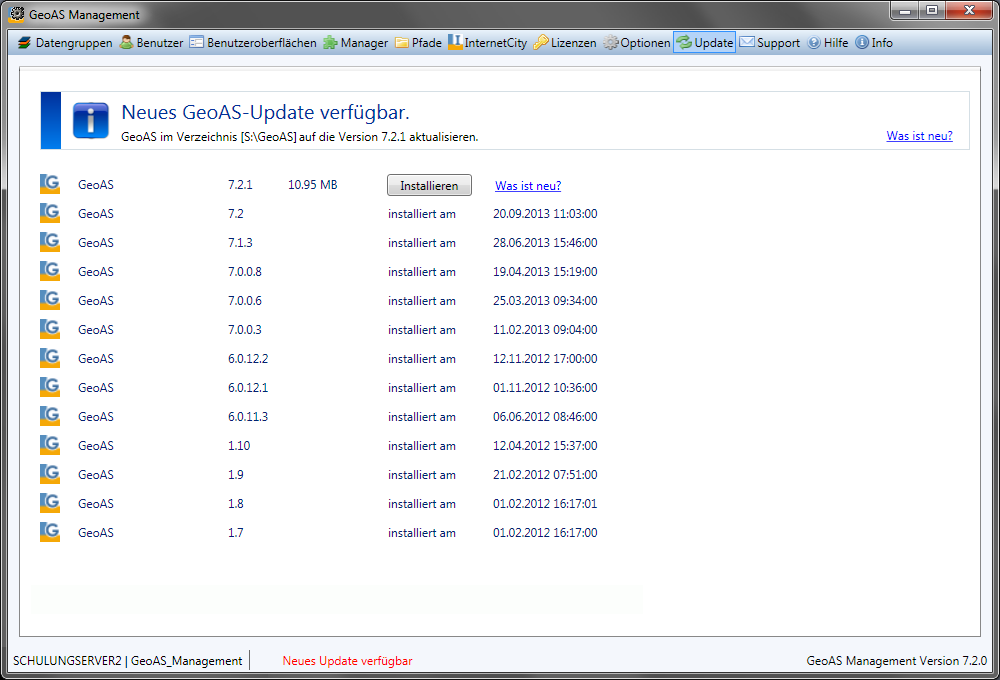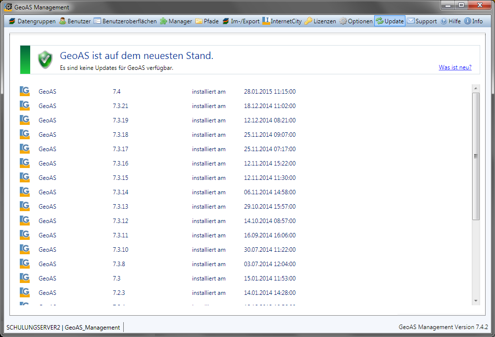 •GeoAS kann nur aktualisiert werden, wenn es nicht in Verwendung ist. Daher müssen alle Benutzer (Clients) das Programm geschlossen haben (auch wenn GeoAS auf einem Server installiert ist und nur auf dem Server Dateien aktualisiert werden). •Im GeoAS Management lässt sich über die Registerkarte Optionen > GeoAS der Zugriff auf GeoAS sperren. Hierbei muss berücksichtigt werden, dass die Sperre nur den Start von GeoAS verhindert, NICHT aber eine laufende Sitzung beendet/sperrt. •Mit Hilfe der Zugriffsübersicht lässt sich in GeoAS Project über das Menü Optionen > Zugriffsübersicht (oder alternativ über Start > Programme > GeoAS > Zugriffsübersicht) kontrollieren, ob GeoAS in Verwendung ist. |
